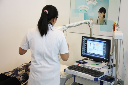 慈銘奧亞健康管理醫院的護士為參會者測量體脂肪數據,數據可直接上傳至慈銘健康管理云服務平臺